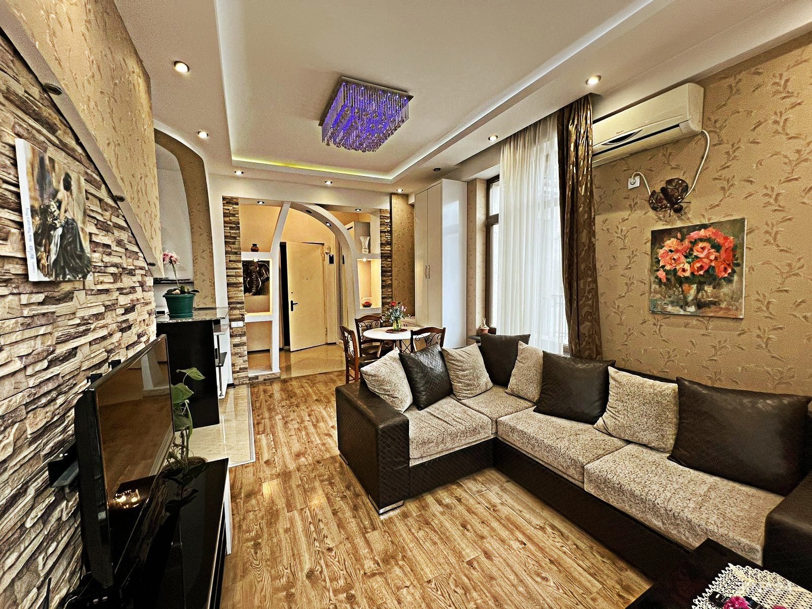 ბინა არის კუთხის, აქვს 4 ფრანგული აივანი. ბინაში არის უფასო Wi-Fi, ტელევიზორი და საკაბელო ტელევიზია. ბინა არის აღჭურვილი ყველა აუცილებლად საჭირო ნივთით.